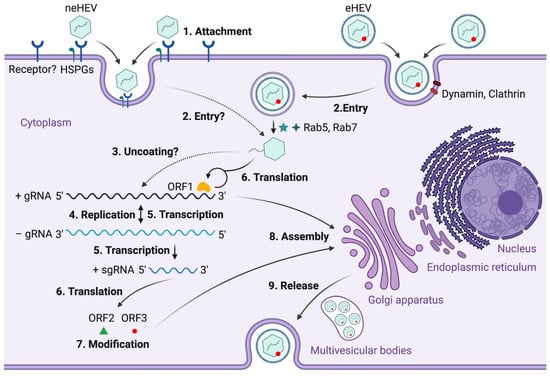 Hepatitis E virus (HEV) life cycle. (1) Non-enveloped hepatitis E viruses (neHEV) bind to heparan sulfate proteoglycans (HSPGs) on the surface of hepatocytes and enter through an unknown cellular receptor. (2) Quasi-enveloped HEV (eHEV) particles enter liver cells through dynamin-dependent, clathrin-mediated endocytosis, which requires the small GTPases Ras-related proteins Rab5 and Rab7. (3) Following the removal of the capsid protein through an unknown mechanism, the viral genomic RNA is released to the cytosol, serving as a template for ORF1 polyprotein translation as well as synthesizing a complementary negative-sense RNA template necessary for HEV replication (4). (5) The intermediate negative-sense RNA then serves as a template for transcription of both full-length genomic and subgenomic mRNAs (sgRNAs). (6) More ORF1 polyproteins are translated from the full-length genomic RNA, and the ORF2 capsid protein and ORF3 multifunctional protein are translated from the sgRNAs. (7) ORF2 and ORF3 undergo post-translational modifications such as glycosylation, phosphorylation, and palmitoylation. (8) ORF2 capsid protein self-assembles into virus-like particles (VLPs) and binds to newly synthesized positive-sense genomic RNA to form progeny HEV virions. (9) ORF3 regulates the host environment through interaction with a number of cellular proteins to promote viral replication and virion secretion (adapted from Wang et al. [41] with permission).