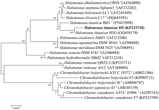 The 16S rRNA gene phylogenetic analysis of strain H5 isolated from Yipinglang Salt Mine showed that it was clustered with H. titanicae BH1 (KY471040), with a similarity of 98.33%. Moreover, H5 and H5G were clustered together with a similarity of 99.93% (Figure 1). Thus, it was preliminarily identified that the strain H5 belonged to Halomonas titanicae.
