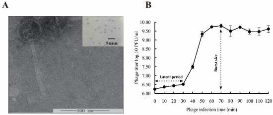 Biological features of phage YPHTV-1. (A) Transmission electron micrograph of YPHTV-1. Scale bar, 100 nm. Inset shows plaques morphology of YPHTV-1; scale bar, 5 mm. (B) One-step growth curve of phage YPHTV-1. Error bars represent the standard deviation of three replicates.