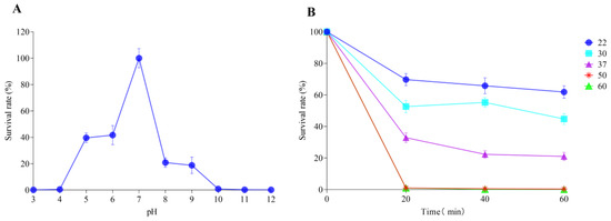 The pH (A) and thermal (B) stability of YPHTV-1. Error bars represent the standard deviation of three replicates.