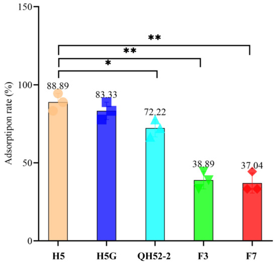 The adsorption of phage YPHTV-1 to different cells. H5 and H5G belong to H. titanicae, QH52-2 belongs to H. ventosae, F3 belongs to C. beijerinckii, and F7 belongs to C. canadensis. The numerical value represents the adsorption rate of the virus on different cells. ANOVA analysis was used to test the difference in the viral adsorption rate between the host bacterium H5 and other cells (* 0.01 < p < 0.05, ** p < 0.01).