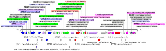 ORF2 encoded the ImmA/IrrE family metalloendopeptidase. ImmA-dependent proteolysis of ImmR repressors may be a conserved mechanism for regulating horizontal gene transfer [50] and radiation resistance [51,52]. ORF14 putatively encoded the MBL folding metallohydrolase belonging to the metalloenzyme superfamily I, potentially improving antibiotic resistance [53]. ORF18 encoded the MazG-like family protein. MazG potentially optimized the progeny phage production by reactivating macromolecule synthesis pathways [54]. ORF43 encoded the O antigen ligase. O antigen ligase participated in the synthesis of lipopolysaccharide (LSP), protected the host from other bacteria or viruses, changed the permeability of cell membrane, tolerated high osmotic pressure, adapted to high-salt environments, increased the resistance of the host, and improved the adaptability of the host to extreme environments [55].