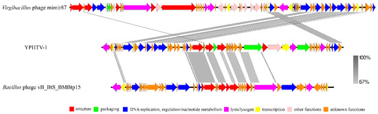 Genome comparison between YPHTV-1 and Virgibacillus phage Mimir87 and Bacillus phage vB_BtS_BMBtp15. The arrow indicates the direction of gene transcription. The gray bar represents similarity.