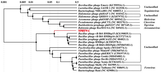 Twenty-three viral genome sequences in GenBank (six with established taxonomic status in ICTV) were compared with the YPHTV-1 to further clarify its evolutionary status. A total of 24 phages were used to construct a phylogenetic tree with amino acid sequences and a heat map with genome-wide ANI. The phylogenetic analysis showed that the phage YPHTV-1 was clustered with an unclassified Bacillus phage (Figure 7). The ANI values of YPHTV-1 in comparison with 23 other viral genomes were 0–70.85% (Figure S1), among which the ANI values of the Bacillus phages were higher (Bacillus phage vB_BtS_BMBtp15 was 70.23%; Bacillus phage vB_BtS_BMBtp1 was 70.85%).