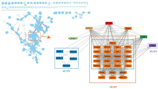 YPHTV-1 genome network analysis. Genomic network analysis was performed by vConTACT2, ClusterONE, and Cytoscape. The reference database was Prokaryotic Viral RefSeq211-Merged (last updated in June 2022), and virus clusters are shown as differently colored boxes. VC217 (orange box): most of the phages were infected with Paenibacillus and belonged to the Fernvirus genus of Caudoviricetes (green box in VC 217); VC173 (blue box): infected with Bacillus with no classification status determined; VC211 (purple box): belonged to Halcyonevirus genus of Caudoviricetes. The classification status of viruses was derived from the ICTV.