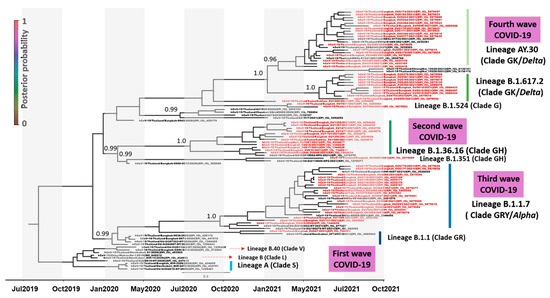 Time–scaled phylogenetic tree of complete spike sequences (nt positions 21,566–25,387, 3831 bp) of SARS-CoV-2 variants. Shown is a maximum clade credibility tree constructed from 10,000 trees sampled from the posterior distribution with mean node ages. Several lineages predominantly represent outbreaks in Thailand, and posterior probability support is given.