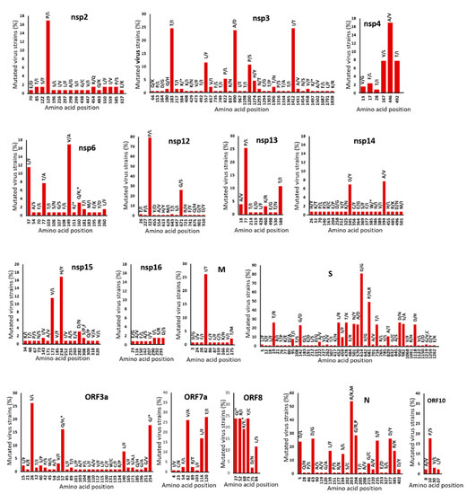 Amino acid mutations in the 130 SARS-CoV-2 genomes analyzed in the study (nt positions 56–29,739, 29,684 bp), compared to the Wuhan-Hu-1 (accession NC_045512) reference strain. The percentage frequency of all amino acid positions in the 130 genomes is shown on the y-axis. NSP, nonstructural protein; M, membrane protein; S, spike protein; N, nucleoprotein; ORF, open reading frame encoding the accessory protein.