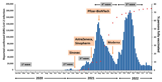 In Thailand, the Sinovac-CoronaVac vaccine was initially approved for use in late February 2021 (Figure 4). Following the outbreak of the third wave with the Alpha variant, the AstraZeneca vaccine and Sinopharm were administered to the Thai population in June 2021. During the fourth wave outbreak with the Delta variant, approximately 10% of the Thai population had received full vaccination, and the Pfizer-BioNTech vaccine was first used in Thailand in August 2021. The Thai population received the Moderna vaccine for the first time in November 2021. During the fifth wave outbreak with the Omicron variant, Thailand achieved a fully vaccinated rate of over 70%.