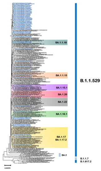 The 63 Thailand B.1.1.529 omicron sequences identified in the present study were combined with 145 publicly available SARS-CoV-2 genome sequences identified worldwide, resulting in a comprehensive dataset of 208 sequences. All sequences in the present study in the B.1.1.529/BA.1 lineage were collected between January 2022 and May 2022. Analysis using clade-defining sequences (https://clades.nextstrain.org/, accessed on 7 January 2023) identified the Thailand sequences as 7 sublineages from the parent lineage B.1.1.529/BA.1 (Figure 5).