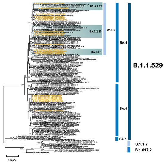 The omicron sublineages BA.4 and BA.5 comprised variants that were detected in Thailand during June 2022 and July 2022. A phylogenetic tree based on complete genome sequences was constructed to investigate genetic relationships between Thailand’s BA.4 and BA.5 variants and global BA.4 and BA.5 variants (Figure 7). The complete genomes of the Thailand BA.4 and BA.5 variants were compared with a set of 110 SARS-CoV-2 genomes publicly available from GISAID. In the tree, 7/210 sequences (3.3%) were categorized as sublineage BA.4, and 15/210 (7.1%) were categorized as sublineage BA.5. The Thailand BA.5 sequences were categorized into four subtypes: BA.5.2, BA.5.2.1, BA.5.2.22, and BA.5.2.26, as determined by an analysis using clade-defining sequences available at (https://clades.nextstrain.org/, accessed on 7 January 2023). In Thailand, BA.4 and its sublineages exhibited high frequencies (>70%) of C241T, G6680A (ORF1a:A2139T), A22786C (Spike:R408S), T22882G (Spike:N440K), and T24163C mutations (Table 3). The most frequent mutations (>80%) present in Thailand BA.5 and its sublineages were C16616A (ORF1b:T1050N), A18163G (ORF1b:I1566V), T22882G (Spike:N440K), C23854A (Spike:N764K), and C26270T (E:T9I).