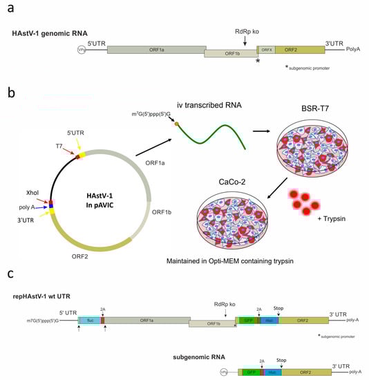 Astroviruses are positive-sense single-stranded RNA viruses. Their genomes contain three to four open reading frames (ORFs), with ORF1a encoding nonstructural proteins; ORF1b, connected to ORF1a through leaky scanning, encoding an RNA-dependent RNA polymerase (RdRp); and ORF2 encoding capsid proteins []. The fourth ORF, called ORFX, is found in some astroviruses, including the classical HAstV strains, and encodes a viroporin-like protein []. The viral genomes contain untranslated regions (UTRs) at the 5′ end of ORF1a and the 3′ end of ORF2. A viral protein (VPg) is linked to the viral RNA at the 5′ terminus, and the 3′ terminus is polyadenylated []. The translation of the genomic viral RNA leads to the synthesis of two polyproteins (nsp1a and nsp1ab). The precursor capsid protein is translated from a subgenomic RNA, which is transcribed from the antigenomic viral RNA using a subgenomic promoter [,].