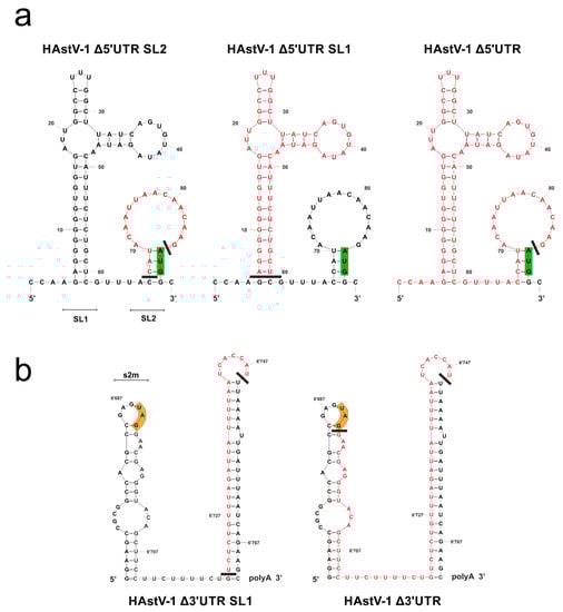 Secondary RNA structures predicted for the 5′ (a) and 3′ (b) UTRs of HAstV-1 and design of UTR deletion mutants. The deleted nucleotides are shown in red. The green boxes indicate the start codon of ORF1a, and the orange boxes indicate the stop codon of ORF2. These structure models were generated using mfold [] and modified using CorelDraw X6 (version 16.0.0.707). SL, stem-loop; s2m, stem-loop 2 motif.