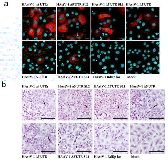 Translation of viral proteins and viral RNA replication in HAstV-1 UTR deletion mutants. (a) BSR-T7 cells transfected with wt HAstV-1 and deletion mutants. The HAstV capsid protein is labeled in red and cellular nuclei in blue. Scale bar = 20 µm. (b) Images from the in situ hybridization for antigenomic HAstV-1 RNA of BSR-T7 cells transfected with wt HAstV-1 and deletion mutants. Red dots and arrows indicate RNA probe hybridization. Scale bar = 50 µm, 40× magnification.