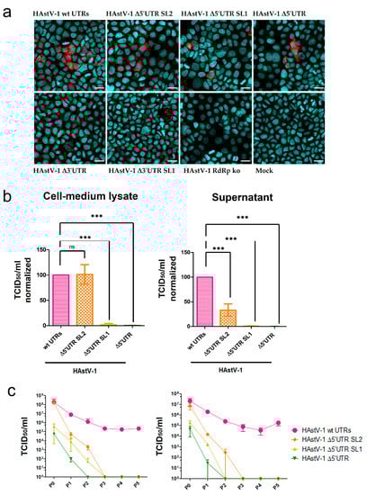 Compromised viral particle assembly and release of HAstV-1 UTR deletion mutants. (a) Immunofluorescence images of CaCo-2 cells infected with supernatants of transfected BSR-T7 samples. The HAstV-1 capsid protein is stained red, and nuclei are stained blue. Scale bar = 20 µm. (b) Titration of HAstV-1 5′ UTR mutants (after BSR-T7 cell transfection = P0) on CaCo-2 cells. The titers (quantified as the 50% tissue culture infectious dose (TCID50)/mL) were normalized to those of wt HAstV-1. Data for the 3′ UTR and HAstV-1 RdRp ko mutants are not shown because these mutants did not infect CaCo-2 cells. The error bars indicate standard deviations from three independent experiments. *** p < 0.001. (c) Virus titers of HAstV-1 mutants on CaCo-2 cells in sequential passages (n = 5). P0, after BSR-T7 cell transfection; P1–P5, after CaCo-2 cell infection (n = 2), ns = nonsignificant.