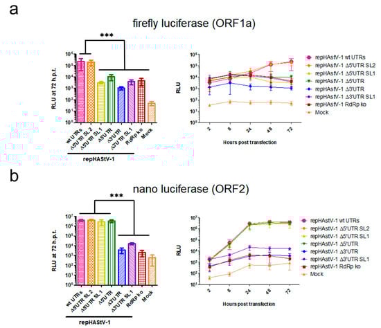 HAstV-1 UTR deletions compromise viral protein expression. Fluc (a) and nluc (b) activity at 72 h after transfection (hpt; left) and over time (2–72 h, right). *** p < 0.01. The experiments were conducted in triplicate. The error bars indicate standard deviations (n = 9). fluc, firefly luciferase; nluc, nanoluciferase; RLUs, relative luminescence units.