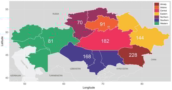 Regional map of Kazakhstan, according to 2020 administrative divisions. Regions are grouped and colored according to broader geographical regions of sample collection, with the numbers denoting the number of sequences sampled from each grouped region (n = 964, NA = 4).