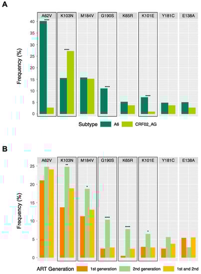 In total, 22 DRMs were present at over 1% frequency, which are summarized according to the subtype in Table 3 and according to ART generation in Table S1. Of these, eight DRMs were present at over 4% frequency, plotted according to subtype and ART generation in Figure 2A,B, respectively. The frequencies of certain DRMs were significantly different between subtypes A6 and CRF02_AG; accessory NRTI-associated mutation A62V was more frequently observed in subtype A6, alongside major NRTI mutation D67N, major NNRTI mutation G190S, and accessory NNRTI mutation K101E, while major NNRTI-associated mutation K103N and accessory NNRTI mutation V179E were more frequently observed in CRF02_AG (Table 3, Figure 2A). Of the eight DRMs present at over 4% frequency, five were significantly more common amongst individuals on second-generation ART regimens, corroborating the findings of more frequent high-level drug resistance amongst second-generation regimens (Figure 2B); however, individual ARVs did not significantly affect the presence of any of the 22 DRMs.