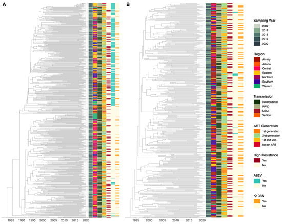 Time-resolved subtype A6 (A, n =552, tMRCA = 1983) and circulating recombinant from CRF02_AG (B, n = 392, tMRCA = 1993) trees. Stacked tiles are colored from left to right according to sequence sampling year, the region of sample collection, reported transmission route, ART generation, high-level drug resistance, and the presence of drug-resistant mutations A62V and K103N, with any missing data colored in grey. Trees were trimmed to the start of Kazakh epidemic for each subtype, removing any outliers and reference genomes used for rooting. PWID = people who inject drugs; MSM = men who have sex with men; ART = antiretroviral therapy.