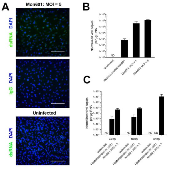 Infection of MIO-M1 human Müller cells with DENV: optimal MOI and viral load. To determine the optimal MOI for further infections, confluent monolayers of MIO-M1 cells were infected with Mon601 at MOIs of 1 and 5, mock-infected with heat-inactivated virus at an MOI of 5, or treated with medium only (n = 3 monolayers per condition). (A) Illustrative fluorescent images of MIO-M1 cells at 48 hpi with Mon601 at an MOI of 5 or after treatment with medium alone; and after immunolabelling to detect double-stranded RNA or isotype-matched negative control antibody. Alexa Fluor 488 (green) with DAPI (blue) nuclear counterstain. Scale bars 100 µm. (B,C). Viral RNA load of Mon601-infected MIO-M1 cells by RT-qPCR at (B) different viral inoculations at 48 hpi: at an MOI of 1 or 5, heat-inactivated virus at an MOI of 5, or medium only; and (C) different time points: 24, 48 and 72 hpi at an MOI of 5, heat-inactivated virus at an MOI of 5, or medium-only control. Genome copy number per µg RNA was normalized to reference genes (B) glyceraldehyde-3-phosphate dehydrogenase or (C) ribosomal protein lateral stalk subunit P0. Error bars denote the standard deviation of the mean. ND = no expression for at least half the replicates, n = 3–4 cultures per condition. Note logarithmic scale. Statistical comparisons were not appropriate, as some conditions yielded no product. Abbreviations: DAPI = 4′,6-diamidino-2-phenylindole, DENV = dengue virus, hpi = hours post-inoculation, MIO-M1 = Moorfields/Institute of Ophthalmology-Müller 1, MOI = multiplicity of infection, RT-qPCR = quantitative reverse transcription polymerase chain reaction.