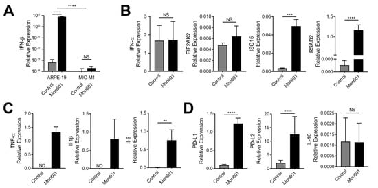 To determine the antiviral response of human Müller cells to infection with DENV, the expression of key molecules involved in the type I IFN response was quantified by RT-qPCR. Infection of MIO-M1 cells with Mon601 did not induce expression of IFN-β transcript (Figure 2A), and this observation was replicated in three experiments, which included kinetic studies of expression at 24, 48, and 72 hpi and infections at an MOI of 1 and an MOI of 5. To determine whether this lack of response was a function of the virus and observed in other cells of the eye, another retinal cell population was infected with Mon601 using the same experimental technique, and IFN-β transcript was measured from the RNA of cell lysate by RT-qPCR. In contrast to MIO-M1 cells, the ARPE-19 human retinal pigment epithelial cell line [] showed a robust IFN-β response by RT-qPCR compared to medium-only ARPE-19 cells (p < 0.0001), confirming that Mon601 can generate IFN-β in response to infection in other cells of the eye (Figure 2A).