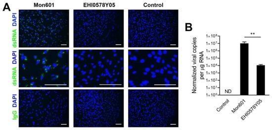 MIO-M1 human Müller cell infection with DENV field isolates. To explore the effect of DENV strain on human Müller cell responses to infection, MIO-M1 cells were infected with the laboratory-adapted Mon601 recombinant strain or one of six DENV field isolates (Table 1) at an MOI of 5, or treated with medium alone (control). Results for a representative field isolate, EHI0578Y05, are displayed. (A). Fluorescent photomicrographs showing cell monolayers at 48 hpi, immunolabelled for double-stranded (ds)RNA (green). Mon601-infected MIO-M1 Müller cells, but not cells infected with EHI0578Y05, stained positively for dsRNA, and no labelling was observed in uninfected cells or cells labelled with the negative control antibody. Primary antibody: J2 mouse anti-dsRNA IgG2aκ. Negative control: isotype-matched irrelevant mouse antibody. Secondary antibody: Alexa Fluor 488 goat anti-mouse IgG (green). Nuclei counterstained with DAPI (blue). All scale bars are 100 µm. (B). Examination of the viral RNA level of DENV-infected MIO-M1 human Müller cells and a representative field isolate, EHI0578Y05. While the field isolate was capable of infecting MIO-M1 cells, it did not replicate as efficiently as the laboratory-adapted Mon601 strain. Virus was not detected in the medium-treated control. Intracellular viral load, displayed as genome equivalents per µg RNA, normalized to reference gene, ribosomal protein lateral stalk subunit P0, n = 6 monolayers per condition. Note logarithmic scale. Error bars represent standard deviation of the mean. Analysis by two-tailed t test, ** p < 0.01. Abbreviations: DAPI = 4′,6-diamidino-2-phenylindole, hpi = hours post-inoculation, Ig = immunoglobulin, MIO-M1 = Moorfields/Institute of Ophthalmology-Müller 1, MOI = multiplicity of infection, dsRNA = double-stranded RNA.