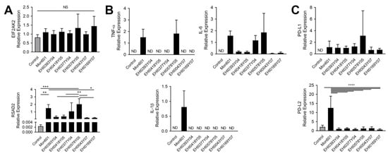 To determine the immune response of human Müller MIO-M1 cells to infection with DENV, expression of molecular transcripts involved in inflammatory and immunomodulatory processes was determined by RT-qPCR. Monolayers of MIO-M1 cells were infected with Mon601 at an MOI of 5 or mock-infected, and RNA was extracted at 48 hpi. The inflammatory response of MIO-M1 cells to infection with Mon601 was characterized by elevated expression of tumour necrosis factor (TNF)-α, interleukin (IL)-1β, and IL-6 (p < 0.01) compared to uninfected control cells (Figure 2C). Infected MIO-M1 cells also showed significantly increased expression of transcripts encoding two immunomodulatory cell surface molecules, programmed death-ligand (PD-L)1 (p < 0.0001) and PD-L2 (p < 0.0001), but expression of the immunomodulatory cytokine, IL-10, was unchanged following infection (Figure 2D). The immunomodulatory cell surface molecule, Fas ligand, was not detected by RT-qPCR in either infected or uninfected conditions. Together, these data indicate that Mon601-infected human Müller MIO-M1 cells mount an immune response characterized by the induction of both pro-inflammatory and immunomodulatory molecules.