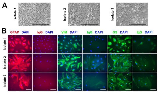 Cell isolates were phenotyped by indirect fluorescent immunolabelling using a previously published method [], with the following antibodies: mouse monoclonal immunoglobulin (Ig)G1 anti-human vimentin antibody (Merck-Millipore, Temecula, CA, USA, catalogue number: MAB3400, working concentration: 5 µg/mL); rabbit polyclonal IgG anti-human glutamine synthetase antibody (Merck-Sigma Aldrich, catalogue number: G2781, working concentration: 15 µg/mL); and sheep polyclonal IgG anti-human glial fibrillary acidic protein (R&D Systems, Minneapolis, MN, USA, catalogue number: AF2594, working concentration: 10 µg/mL), or a relevant negative control antibody in matched concentration, i.e., mouse monoclonal IgG1 (BD Bioscience, San Diego, CA, USA, catalogue number: 554121), or sheep or rabbit IgG (Merck-Sigma Aldrich).
