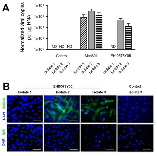 Monolayers of primary human Müller cells were infected with Mon601 or a representative field strain, EHI0578Y05, at an MOI of 5. At 48 hpi, the CPE varied across Müller isolates and DENV strains, but was most apparent for Müller cell isolate 3 following infection by Mon601 (Supplementary Figure S3). At this point, RNA was extracted from cells, or monolayers were fixed for immunolabelling. Viral RNA load, as measured by RT-qPCR, reached higher levels in cell isolates infected with Mon601 compared with EHI0578Y05 (Figure 6A). Immunolabelling of dsRNA demonstrated greater infection of Müller isolate 2, with nearly all cells appearing infected (Figure 6B), consistent with the results obtained by RT-qPCR.