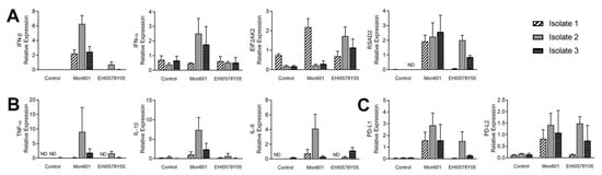 Transcripts encoding the inflammatory cytokines, TNF-α, IL-1β and IL-6, were not consistently detected in monolayers subjected to mock infection with medium alone, but infection with all of the DENV isolates stimulated IL-6 expression, although notably higher levels were seen with DENV2 strains (Figure 4B). Infection with Mon601 induced production of TNF-α and IL-1β RNA, and the EHI0578Y05 strain also stimulated expression of TNF-α RNA. Expression of the immunomodulatory transcript, PD-L1, was upregulated with infection with all DENV strains, and PD-L2 expression was relatively high in Mon601-infected cells (p < 0.001, Figure 4C). The results show that differential molecular responses of human Müller MIO-M1 are seen across infection with DENV1 and DENV2 strains. The DENV2 isolate EHI0578Y05, was used for further analysis since it showed the best replication and induction of immune responses.
