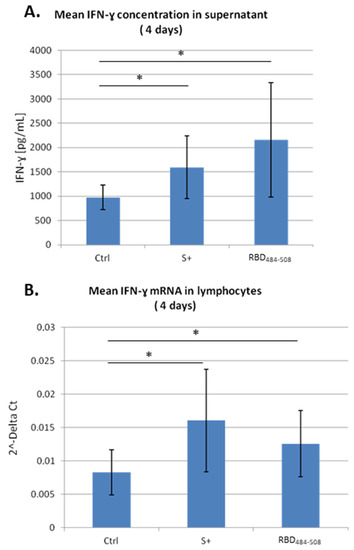 (A): IFN-γ concentration [pg/mL] in the supernatant and (B) mRNA lymphocyte expression level 4 days after pseudovirus infection (S+) or following RBD484–508 peptide treatment. Values displayed in the figures represent the means of three independent experiments ± standard deviation (SD). * p < 0.05 by Anova test.