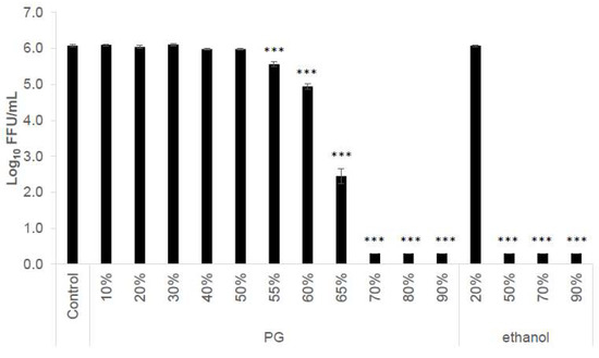 Antiviral activity evaluations were conducted following a standardized protocol in ASTM-E1052-20, with minor modifications. In brief, IAV solution (5 μL; 6.0 × 105 FFU) and 45 μL of the evaluation sample were mixed and allowed to react for 5 min at 22–23 °C, and 950 μL of SFM was added to stop the reaction. PG and ethanol were used as the evaluation sample, and were diluted with distilled water to 10–90% (v/v)to 20–90% (w/w), respectively. The sample was immediately titrated using the focus-forming assay described below.