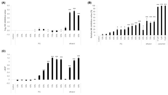 17], and it is possible that changes in excess molar enthalpy affected its antiviral activity. Similarly, ethanol shows a rapid increase in antibacterial activity at concentrations higher than 30–40