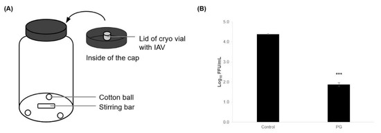 Three cotton balls (Yamatokojo Co., Ltd., Osaka, Japan) soaked in a total of 1 mL PG were placed at the bottom of a 1 L glass bottle (Tokyo Garasu Kikai Co., Ltd., Tokyo, Japan) and stirred at 500 rpm using a magnetic stirrer (As One Corporation, Osaka, Japan) at 22–23 °C for 30 min. IAV solution (1.5 μL; 8.3 × 105 FFU) was dried on the lid of a cryo vial (Thermo Fisher Scientific Japan K.K.) for 30 min at 22–23 °C. This lid was attached to the inside of a 1 L bottle cap. The cap was then replaced on the 1 L bottle with the IAV lid attached, exposing the lid to PG vapor for 30 min at 22–23 °C. After exposure, the lid was removed from the cap. The IAV on the lid was dissolved in SFM and immediately titrated using the focus-forming assay described below.