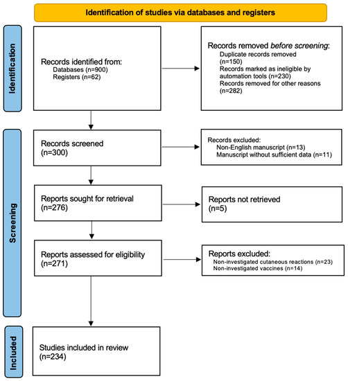 The first research led to the discovery of 962 articles. The second research led to a skimming of 662 articles for various reasons: duplicate articles, articles not written in English. A total of 300 reports were initially found by searching the literature. Therefore, the literature review was completed by following the inclusion and exclusion criteria that we indicated in the Section 2. In the last review, in conclusion, we selected a total of 234 articles involving more than 600 patients. We have divided the Section 3 into various sub-sections to ensure greater understanding for readers; therefore, each dermatological disease will have a dedicated sub-paragraph, for example psoriasis, atopic dermatitis, hidradenitis suppurativa, lichen planus, alopecia areata, and vitiligo. Finally, we have chosen to also include a sub-paragraph with the wording “miscellaneous” where we have enclosed other dermatological pathologies found in the literature related to COVID-19 vaccination, such as morphea, chilblains, pityriasis lichenoides et varioliformis acuta, Henoch–Schönlein purpur, lichen striatus and Rowell syndrome.