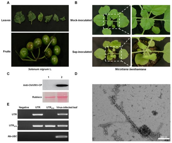 Symptoms of virus-infected Solanum nigrum L. and Nicotiana benthamiana. (A) Symptoms of virus-infected S. nigrum L. from field; (B) symptoms on plants of N. benthamiana inoculated with water or viral sap at 10 dpi; (C) Western blot confirming the presence of ChiVMV in systemic leaves of inoculated plants. 1. Systemic leaf of Mock-inoculated plant; 2. systemic leaf of sap-inoculated plant; (D) virions observed by TEM in negatively stained samples of systemic leaves of N. benthamiana plants. Bars represent 200 nm; (E) RT-PCR confirming the presence of the additional 15 nt of 5′ UTR in systemic leaves of inoculated plants (UTR: with 15 nt; UTRd15: without 15 nt).