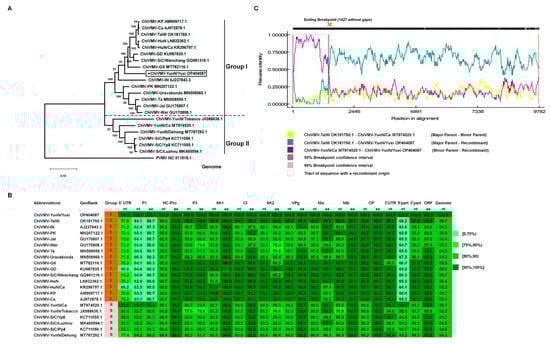 The complete genomic RNA sequence of ChiVMV-YunN/Yuxi has a 5′ UTR (nts 1–186) and 3′ UTR (nts 9457–9741), with a single large open reading frame (ORF) encoding a polyprotein of 3089 aa residues. To investigate the phylogenetic relationships between ChiVMV-YunN/Yuxi and other ChiVMV (es), the full genome sequences of 20 ChiVMV isolates were retrieved from GenBank, and a NJ phylogenetic tree was inferred by Mega X. The isolates clustered into two groups, with ChiVMV-YunN/Yuxi in Group I (Figure 2A). ChiVMV-YunN/Yuxi had an 84.0–89.7% nucleotide identity to other Group I sequences and an 82.2–86.1% identity to isolates of Group II (Figure 2B). Among the different genome regions, the greatest differences between isolates were found in P1 (Figure 2B). The 5′ part (5′ UTR to P1) of ChiVMV-YunN/Yuxi had the highest nucleotide identity (95.7%) to the corresponding region of ChiVMV-YunN/Ca (Group II), but the 3′ part (HC-Pro to 3′ UTR) was most closely related (92.5% nucleotide identity) to ChiVMV-TaiW in Group I (Figure S2). A phylogenetic analysis also showed that the 5′ part of ChiVMV-YunN/Yuxi clustered into Group II, but that the 3′ part clustered in Group I (Figure S2). This suggested that ChiVMV-YunN/Yuxi might be a recombinant between Group I and Group II isolates.