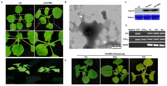 Interestingly, the 5′ UTR of ChiVMV-YunN/Yuxi is 15 nucleotides (‘AAAAATAAAACAACC’) longer than other reported isolates (Figure S3). To confirm the presence of additional 15 nt in 5′ UTR, virus infected-plants were collected, and RT-PCR confirmed the presence of 5′ UTR, with an additional 15 nt in the systemic (non-inoculated) leaves of inoculated plants (Figure 1E). Concurrently, an infectious clone of ChiVMV-YunN/Yuxi was constructed for further investigation. The full-length cDNA infectious clone (pChiVMV) was transformed into A. tumefaciens, which was then delivered to N. benthamiana plantlets by infiltration. Severe mosaic was detected in systemic leaves at 5 days post-infiltration (Figure 3A). The flexuous filamentous virions were observed in new non-inoculated leaves by TEM (Figure 3B) and Western blot confirmed that the virus had spread systemically in the inoculated plants (Figure 3C). These results demonstrate the infectivity of the full-length ChiVMV-YunN/Yuxi. The virus was then transmitted by sap inoculation for three generations, and all plants developed severe mosaic symptoms in their systemic leaves 4 days after inoculation (Figure 3D). RT-PCR also confirmed that the additional 15 nt in the 5′ UTR were stable during this subculture (Figure 3E).