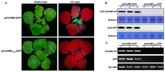 Expression of eGFP by the infectious clone pChiVMV-GFP in N. benthamiana. (A) Symptoms in N. benthamiana plants inoculated with pChiVMV-GFP or pChiVMVd15-GFP (where first 15 nt of pChiVMV-GFP genome were deleted) under UV and natural light at 7 dpi. (B) Western blot analysis confirming the presence of ChiVMV-GFP or ChiVMVd15-GFP in the infected leaves of N. benthamiana plants (3 plants/treatment). (C) RT-PCR analysis confirming the presence of ChiVMV-GFP or ChiVMVd15-GFP in the infected leaves of N. benthamiana plants.