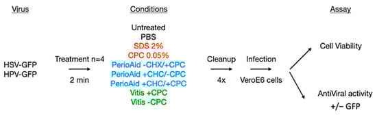 In vitro evaluation of CPC-containing mouthwash antiviral activity. Schematic representation of the workflow used for evaluating mouthwashes against HPV and HSV viruses.