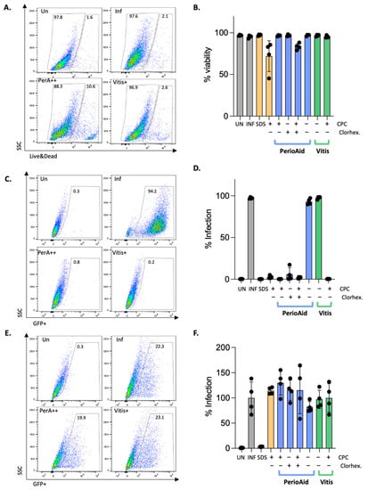 In vitro evaluation of CPC-containing mouthwash antiviral activity. (A) Flow cytometry plots of Live/Dead staining of cells treated with the corresponding conditions. (B) Viability of cells treated in vitro with CPC-containing mouthwash protocol. Data represents % of viable cells in each condition. (C) Flow cytometry plots of HSV in vitro infection, measured by GFP expression. (D) Blockade of HSV infection after pretreatment with the different CPC formulations tested. Bars represent the percentage of GFP-expressing cells measured by flow cytometry. (E) Flow cytometry plots of HPV in vitro infection, measured by GFP expression. (F) Relative HPV infection after pretreatment with the different CPC formulations tested. Bars represent the percentage of GFP-expressing cells, compared to the infected condition, measured by flow cytometry. All determinations were performed in quadruplicate. Bars represent mean +/− SD of 4 independent determinations. Yellow bars, positive controls containing SDS or CPC; Blue bars, PerioAid-based mouthwashes; Green bars, Vitis-based mouthwashes. Un, uninfected; Inf, infected untreated; PerA++, PerioAid containing CPC and chlorhexidine; Vitis+; Vitis containing CPC.