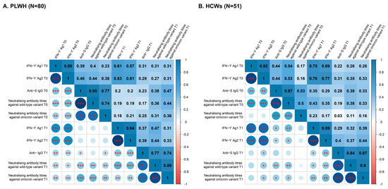 Spearman correlation matrix between IFN−ɣ Ag1, IFN−ɣ Ag2, Anti-S IgG, neutralising antibody titers against wild type, and neutralising antibody titers against Omicron variants at T0 and T1 among PLWH (A) and HCWs (B). Positive correlations are displayed in blue, and negative correlations are displayed in red. Colour intensity is proportional to the correlation coefficients. Correlations with p-value > 0.01 were considered as insignificant; in this case, the correlation coefficient values are displayed in blank colour. p-value: *** < 0.001, ** < 0.01, * < 0.05.
