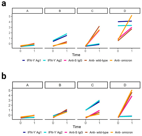 Clustering of T-cell and humoral immune responses evolution. IFN-ɣ Ag1, IFN-ɣ Ag2, Anti-S IgG, and neutralising antibody titers against wild type and Omicron variants patterns of evolution in each of the four clusters (a) among all individuals either SARS-CoV-2 experienced and naïve (total n = 117; cluster A: n = 86, cluster B: n = 21, cluster C: n = 10, cluster D: n = 3), (b) among SARS-CoV-2 naïve individuals (cluster A: n = 35, cluster B: n = 18, cluster C: n = 7, cluster D: n = 3).