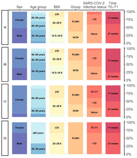 We subsequently explored whether distinct patterns of T-cell and humoral immune response evolution could be observed using a non-parametric longitudinal clustering algorithm. Based on the co-evolution of markers reflecting T-cell and humoral immune responses between T0 and T1, we identified four distinct patterns of immune response evolution (Figure 2a). Participants included in the first cluster (cluster A) (71.7% of the sample, n = 86) demonstrated primarily, and despite a slight increase in each parameter, persistently low markers of both T-cell and humoral immune responses after the administration of the third vaccine dose (Figure 2a and Figure 3, Table S1). Participants belonging to this cluster were mostly PLWH (62.8%, n = 54) including 38.9% (n = 21) with history of AIDS (Figure 4, Table S2). Compared to other clusters, participants tended to have a lower BMI (25.9 ± 5.1, p = 0.052) (Figure 4, Table S2). We also found that more than half of individuals (59.3%, n = 51) included in this cluster did not experience a SARS-CoV-2 infection in the past (p < 0.05) (Figure 4, Table S2). Indeed, only 32.6% (n = 28) of the participants were previously infected with SARS-CoV-2 before T0 and even less (8.1%, n = 7) between T0 and T1. Individuals comprising the second cluster (cluster B) (17.5% of the sample, n = 21) were those who showed the highest median parameters reflecting T-cell immune response at both time points (1.6 and 4.4 for Ag1 and 2.2 and 6.1 for Ag2, at T0 and T1, respectively) (Figure 3, Table S1). In the same line, participants in this cluster had the highest initial median anti-S IgG and nAbTs WT but demonstrated a less pronounced increase in these parameters between T0 and T1 compared to participants from cluster C. Median nAbTS Om was similar at both time points compared to those in cluster A. More than half of the individuals in this cluster were women (61.9 %, n = 13) and HCWs (61.9%, n = 13) (Figure 4, Table S2). Participants in this cluster tended to be younger (42.1 ± 10.1, p = 0.078) compared to individuals in clusters A and C and to have a lower BMI (26.6 ± 7.4, p = 0.052) than individuals from cluster C. Furthermore, 52.4% (n = 11) experienced SARS-CoV-2 infection before T0, and only 1 participant was infected between T0 and T1. Participants in the third cluster (cluster C) (8.3% of the subsample, n = 10) demonstrated the lowest initial T-cell immune responses, but compared to participants in cluster A, they achieved a higher response after the administration of the third vaccine dose, although still limited. In contrast, compared to other clusters, they demonstrated the most remarkable evolution in humoral immune responses between T0 and T1, with the most robust neutralising activity against wild type and Omicron, and the highest median anti-S IgG titers at T1 (Figure 3, Table S1). This cluster was characterised by participants who were predominantly women (90%, n = 9) and tended to be older (51 ± 11 years) (p = 0.078) and to have a higher body mass index (BMI) (31.3 ± 9.3 kg/m2) (p = 0.052) than those in cluster A and B (Figure 4, Table S2). PLWH and HCWs represented respectively 60% (n = 6) and 40% (n = 4) of the participants in this cluster. When considering the history of SARS-CoV-2 infection, 30% (n = 3) had never been infected, 30% (n = 3) were infected before T0, and 40% (n = 4) were infected between T0 and T1. Thus, cluster C tended to represent older women who experienced SARS-CoV-2 with robust humoral immune responses and limited T-cell immune responses. The fourth cluster (cluster D) contained three patients with very heterogeneous characteristics and unclassifiable patterns of immune response evolution (Figure 4, Table S2). We then focused on the SARS-CoV-2 naïve population cluster analysis which also led to the identification of four distinct patterns of immune response evolution (Figure 2b). Individuals included in the first cluster (cluster A, n = 35), the third cluster (cluster C, n = 7), and the fourth cluster (cluster, n = 3) showed similar patterns of immune response evolution between T0 and T1 (Figure 2b, Table S3), compared to the cluster A, cluster B, and cluster C of the total population, respectively (Figure 2a). In contrast, the patterns of immune response evolution in the second cluster (cluster B) (n = 18) due to low T-cell responses at T0 and a less-pronounced increase between T0 and T1 (Figure 2b, Table S3). We did not find any significant differences in terms of demographic and clinical factors between the different clusters (Table S4). Concerning PLWH and HCWs sub-populations, we also identified four distinct clusters (Figure S2a and Figure S2b for PLWH and HCWs, respectively).