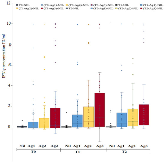 The Friedman test examined the differences in the cellular immune response for each SARS-CoV-2 T-cell epitope at each time point. Data analysis revealed a statistically significant difference in IFN-γ secretion across the three time points when comparing the median differences of CD4+ T-cell responses to COVID-19 (Ag1) (X2 = 6.138, p = 0.046). A Bonferroni post hoc test showed that IFN-γ levels secreted at T0 had a significantly lower median compared to IFN-γ levels measured at T1 and T2 (p = 0.027 and p = 0.042), respectively, while there were no statistically significant median differences in IFN-γ levels between T1 and T2 (p = 0.854) (Figure 1). Likewise, the data showed that there was a statistically significant difference between the three time points concerning the median differences in IFN-γ levels that were assessed as a result of stimulation with COVID-19 (Ag2) (X2 = 9.937, p = 0.007). A Bonferroni post hoc test showed that IFN-γ levels measured at T0 had a significantly lower median than IFN-γ levels measured at both T1 and T2, p = 0.007 and p = 0.008, respectively. At the same time, there were no statistically significant median differences between T1 and T2, p = 0.951 (Figure 1). However, there was no statistically significant difference in the median IFN-γ levels at each of the three-time points (X2 = 4.299, p = 0.117) for COVID-19 (Ag3) (Figure 1).
