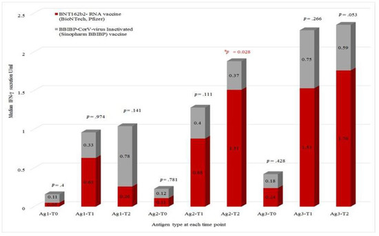 We compared the IFN-γ secretion in response to the three COVID-19 antigens across the three measurement times according to COVID-19 vaccine type (BNT162b2 vs. BBIBP-CorV). The data revealed that patients who received the BNT162b2 vaccine had significantly higher IFN-γ levels in response to Ag2 than those who received the BBIBP-CorV vaccine (p = 0.028). At the same time, there was no statistically significant median difference for the other measurement times when using the Mann–Whitney U test (Figure 2).