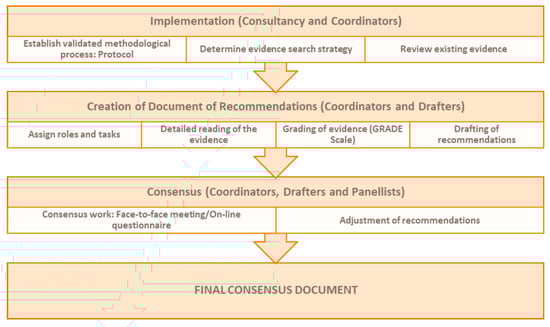 The three-round consensus was conducted in two distinct phases: a face-to face meeting with 26 experts divided into three groups (25 October 2022) and an online questionnaire answered by 34 experts to validate the recommendations. Consensus was regarded as having been reached when 80% of the experts ticked the highest degree of agreement on a scale of 1 to 9.