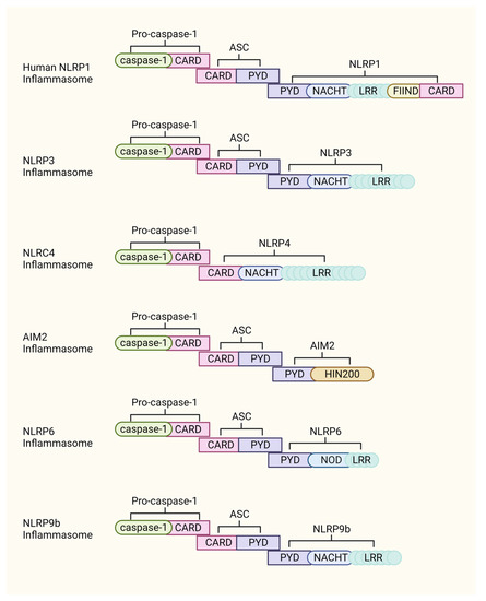 Compositions of different inflammasomes. Most of the identified inflammasomes are composed of NLR proteins, with the exception of NLR4, which recruits ASC by interacting with the PYD domain. The PYD and CARD domains of ASC serve as anchor points for subsequent recruitment of procaspase 1 to complete inflammasome assembly. NLRC4 itself carries the CARD domain, so it interacts directly with procaspase 1 and ASC is not required to form the NLRC4 inflammasome. The figure was created in BioRender.