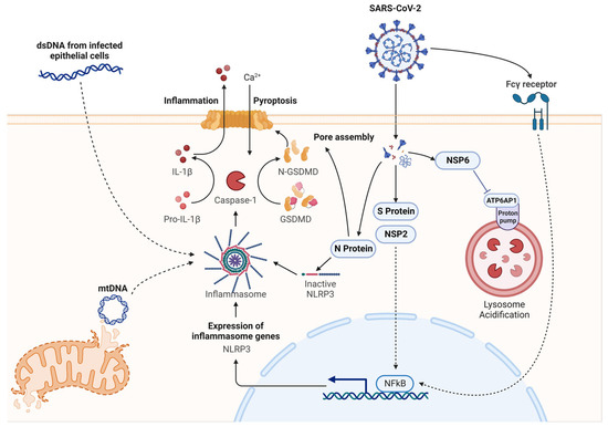 SARS-CoV-2 activates the NLRP3 inflammasome through multiple pathways. SARS-CoV-2 infects macrophages through the Fcγ receptor. Viral proteins, such as S protein and NSP2, also stimulate NLRP3 transcription dependent on NF-κB signaling. N protein of SARS-CoV-2 directly interacts with NLRP3 to induce inflammasome formation and subsequent inflammatory response. dsDNA released from infected epithelial cells and mtDNA released from damaged mitochondria can also activate the inflammasome. The figure was created in BioRender.