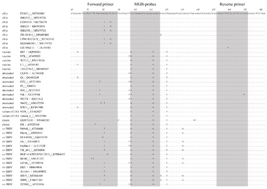 Alignment of the TaqMan-minor groove-binding (MGB) real-time reverse transcription polymerase chain reaction (RT-PCR)-amplified region. Various representative nVarIBDV and non-nVarIBDV isolates were included in the alignment. Forward and reverse primers and the probe target site are indicated using shadow position of the reference strain FJ2021 (MZ593902) in the alignment.