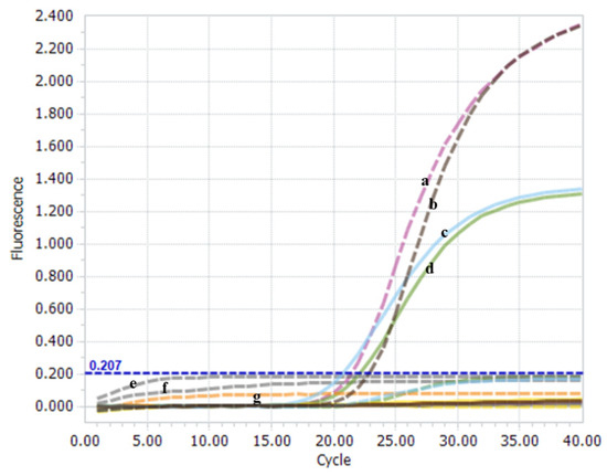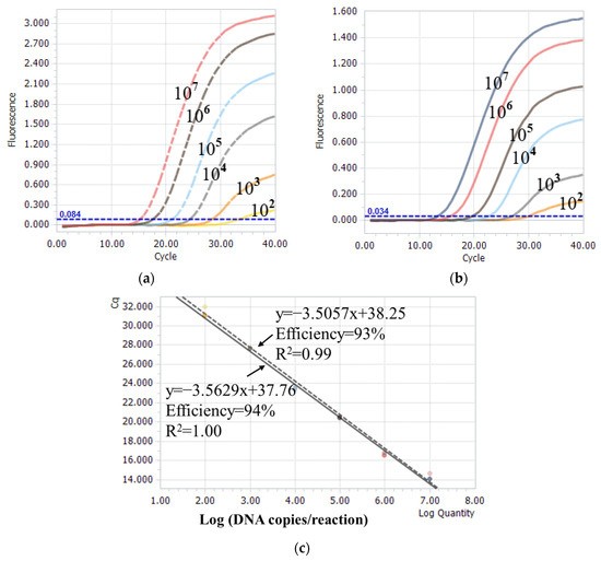 Serial dilutions (2 × 106 copies/μL to 2 × 101 copies/μL) of two positive plasmids prepared using deionized water were added in the respective reaction mix to evaluate the sensitivities of primers and probes. A standard curve was generated by plotting the Cq values vs. log10 of 10-fold serial dilutions (107 to 102) of plasmid DNA. Analyses for relative and absolute sensitivities were conducted in triplicate. The standard curve and assay efficiency were established using the LightCycler® 96 SW 1.1 software.